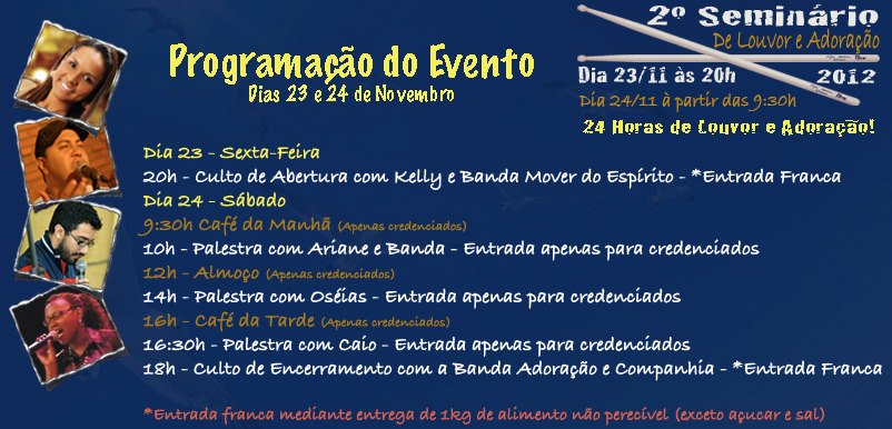 Estarei ministrando no 2º Seminario de Louvor & Adoração na Igreja Batista da Mooca no dia 24/11/12 as 14h e sera um prazer telo presente neste grande dia, vejo você lá.