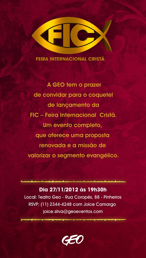 Acabo de ser convidado formalmente para estar presente na coletiva de imprensa da FIC "Feira Internacional Cristã" promovida pela Geo Eventos "Rede Globo"